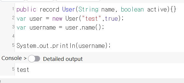 public record User(String name, boolean active){} var user = new User("test",true); //아래에 getName이 아닌 name인 것을 확인할 수 있다. var username = user.name();