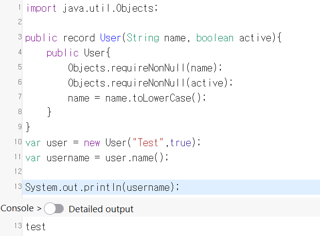 public record User(String name, boolean active){ public User{ Objects.requireNonNull(name); Objects.requireNonNull(active); name = name.toLowerCase(); } }